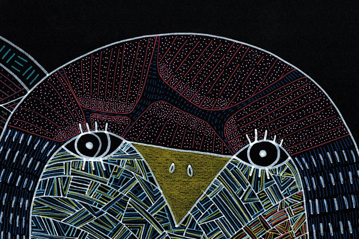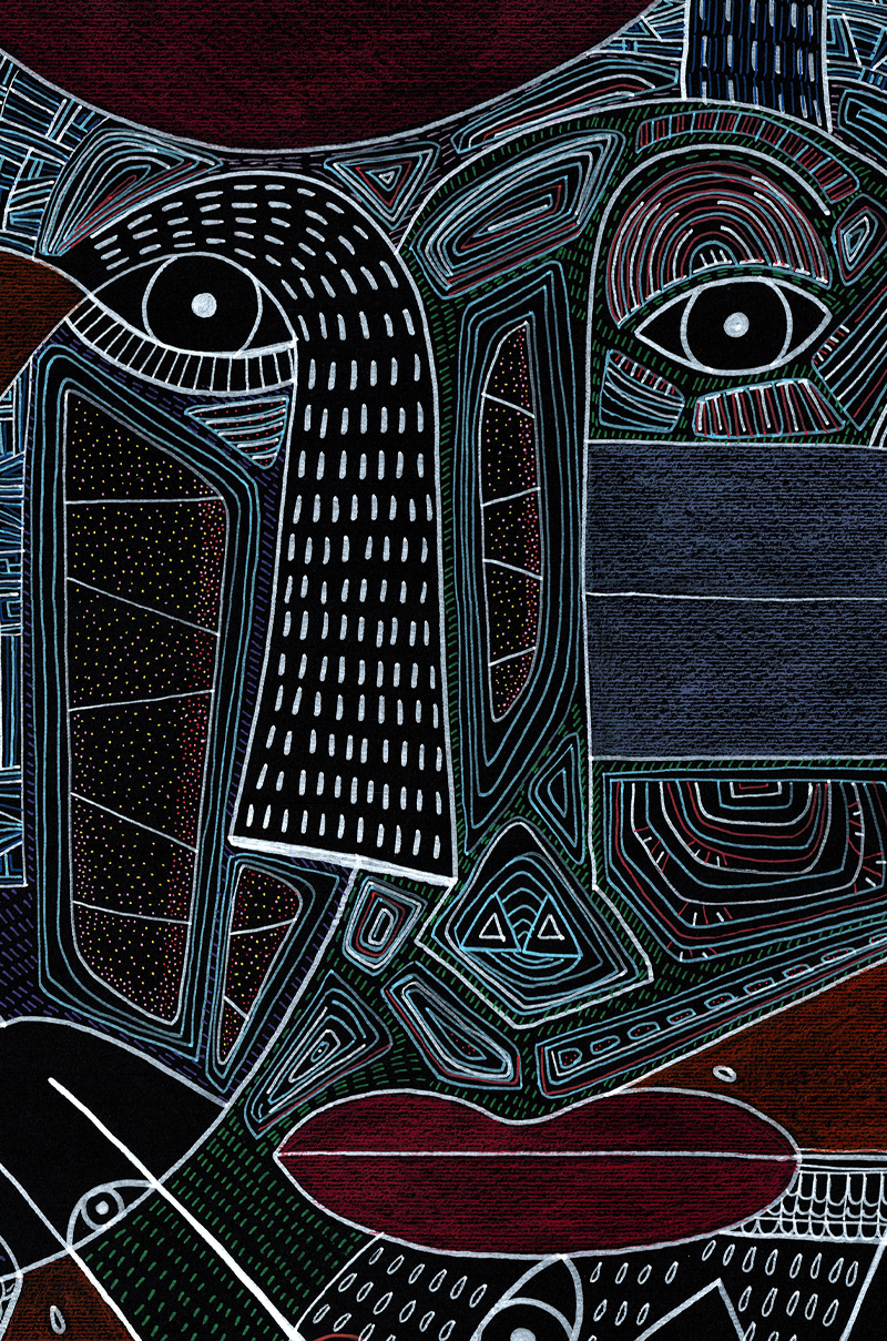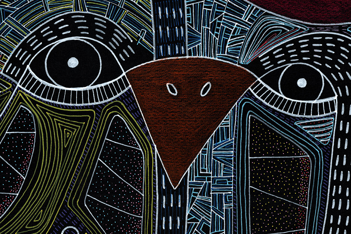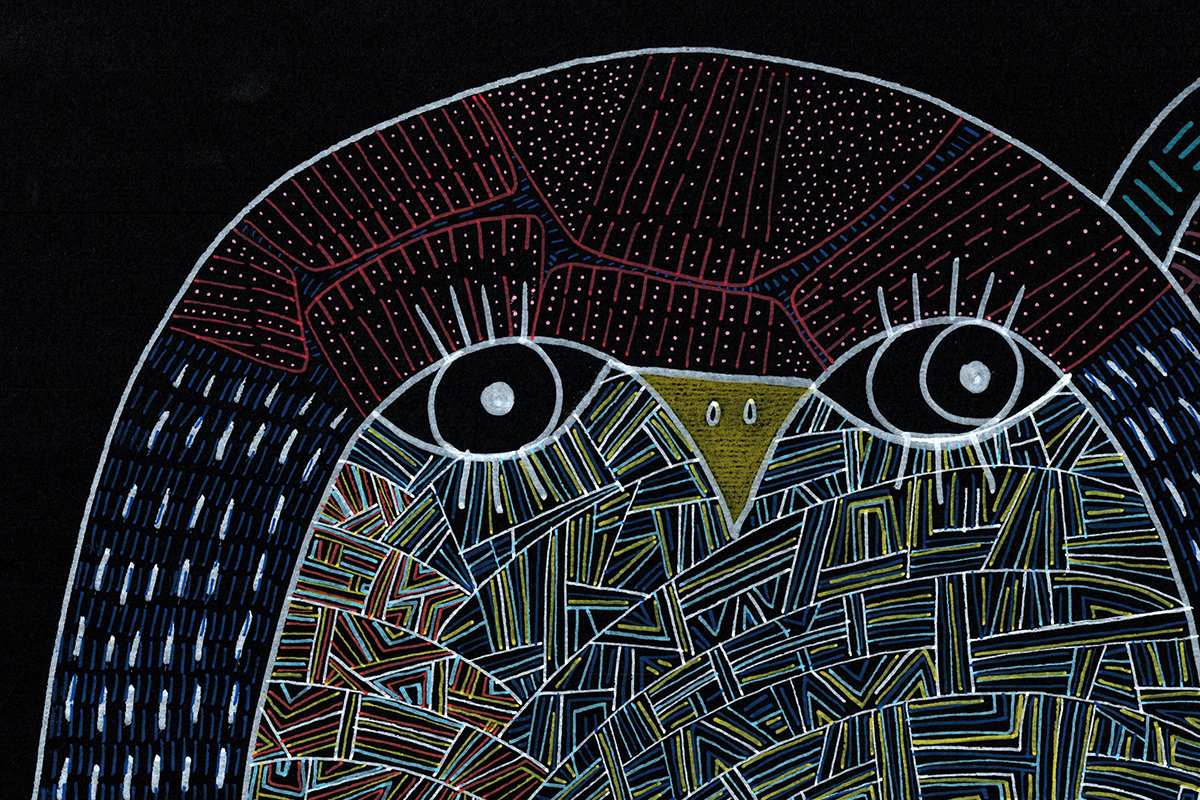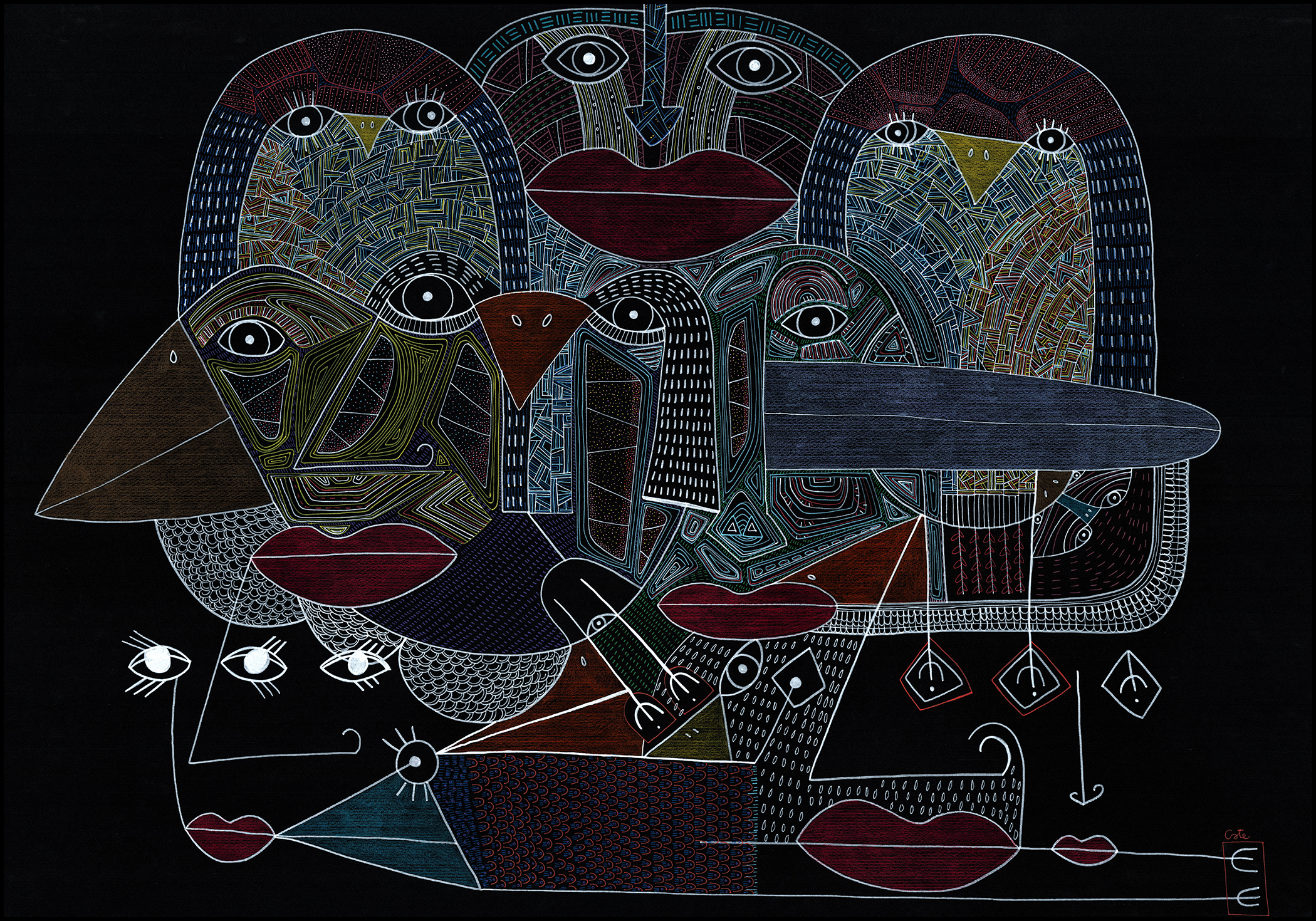 Gli amanti guardano dritto davanti a sè. Un miscuglio di emozioni da gestire, insieme al ricordo di dodò. Esce un'espressione imbarazzata a lui, papera, una fredda indifferenza a lei, bassotto blu. Nelle loro mente di uccelli si scambiano sguardi complici. Cupido artefice se la gode. Cartoncino nero 250gr 100x70 cm Mixed media: Pennarelli a vernice e matite colorate 200€ + spese di spedizione Pronto per essere incorniciato!