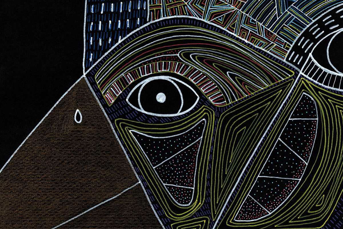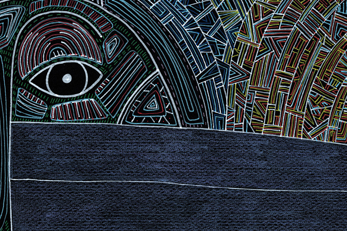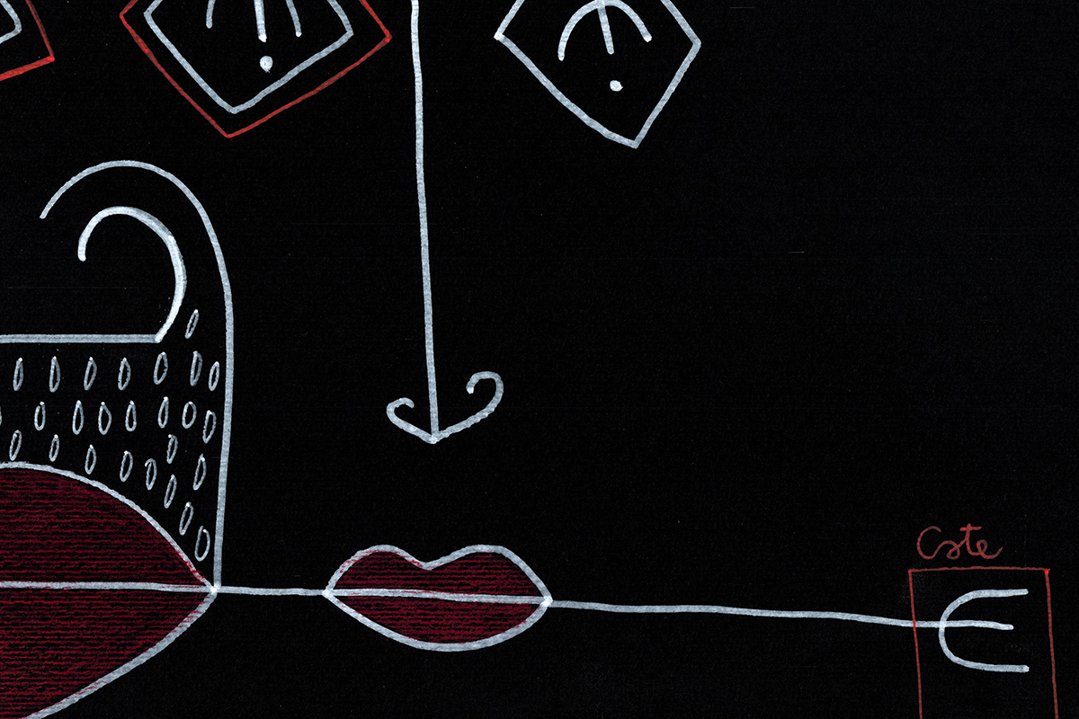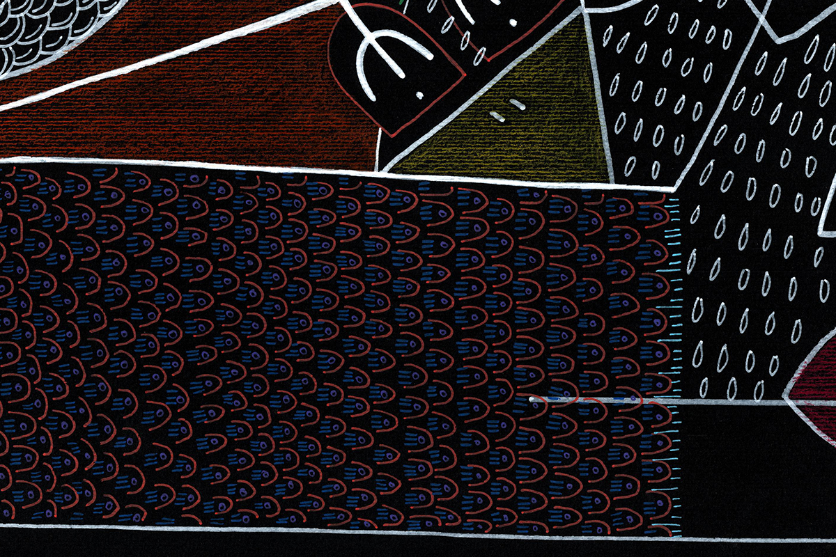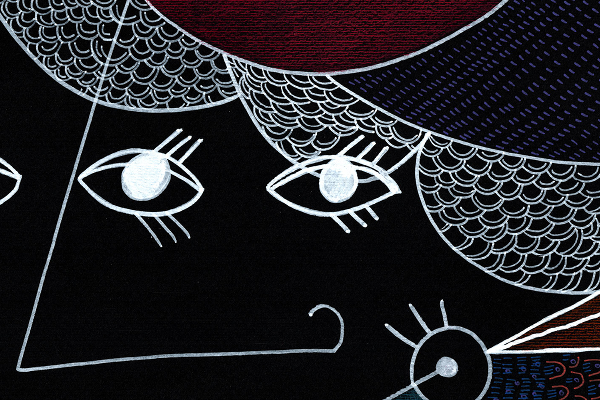 Gli amanti guardano dritto davanti a sè. Un miscuglio di emozioni da gestire, insieme al ricordo di dodò. Esce un'espressione imbarazzata a lui, papera, una fredda indifferenza a lei, bassotto blu. Nelle loro mente di uccelli si scambiano sguardi complici. Cupido artefice se la gode. Cartoncino nero 250gr 100x70 cm Mixed media: Pennarelli a vernice e matite colorate 200€ + spese di spedizione Pronto per essere incorniciato!