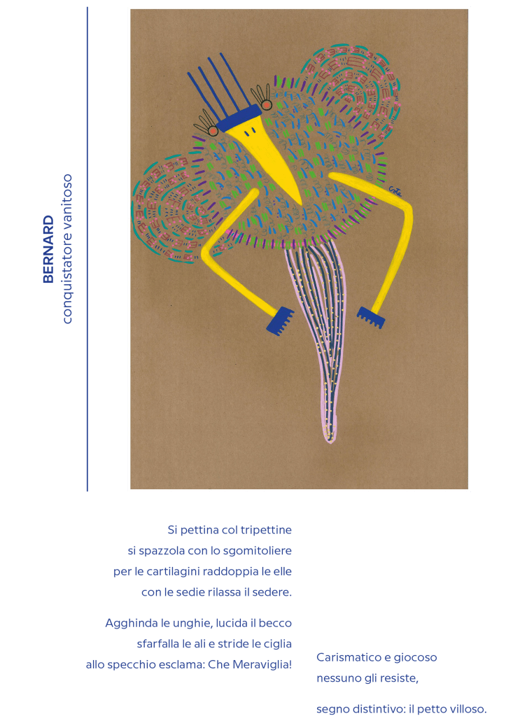 descrizione 35 uccelli (uscelin) che esaltano la loro unicità di forma, colori, caratteristiche e proprio perchè tuttə diversə volano sempre insieme. Nascono veloci con gli uniposca e le matite colorate, hanno un nome e una personalità.