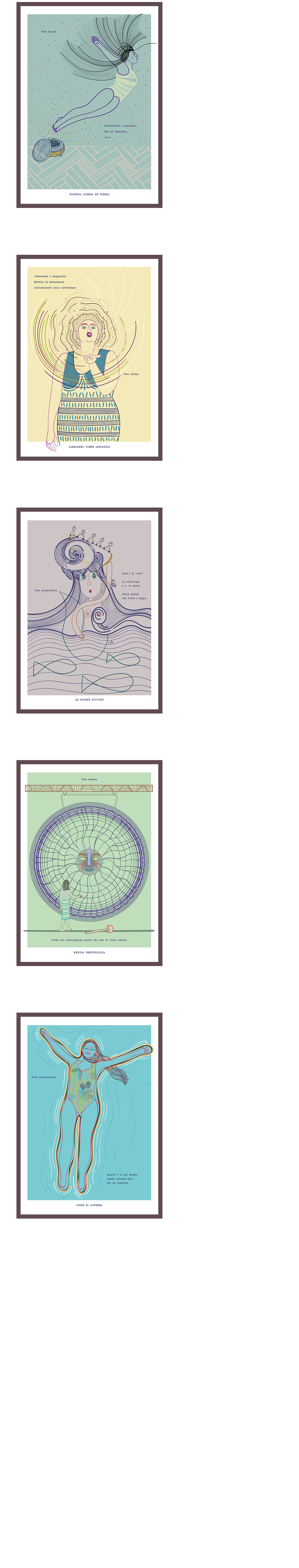 descrizione Un progetto di rivisitazione dei miti classici per suggerire archetipi femminili liberi dalla stereotipizzazione insita nell’inconscio collettivo. Succede allora che le sirene non sono portatrici di morte ma salvano la vita; Cassandra viene ascoltata; Pandora disobbedisce e conosce se stessa, così grazie al vaso libera se stessa; Medusa è intelligenza che lotta sensibilizzando e la sua testa è un gong che risveglia le coscienze; Circe è lei stessa la sua isola.